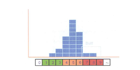 نفوذ به منطقه قرمز نه باید به صورت متناوب رخ دهد و نه اینکه خیلی به ندرت اتفاق افتد. در این مورد میزان پیشنهادی کمتر از 10 درصد می باشد. مثال پیشین را در نظر بگیرید که در آن اندازه بافر محدودیت 9 روز محاسبه گردید. فرض کنید تعداد 25 قطعه داریم و سطح 5 درصد را به عنوان سطح نفوذ به منطقه قرمز در نظر بگیریم. در این حالت انتظار داریم که اکثر قطعات در منطقه 2 (زرد) فعالیتشان به اتمام برسد. شکل 2 را در نظر بگیرید.