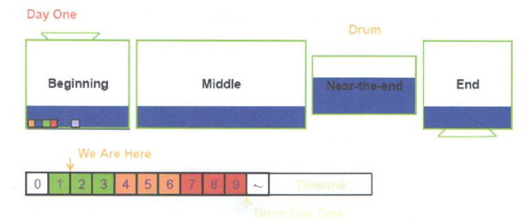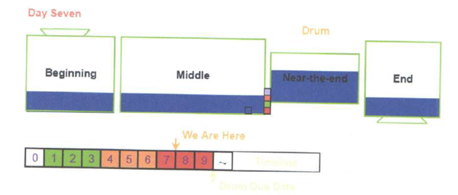 در اینجا هر بچه تمثیلی از یک ایستگاه کاری است. طبل هم نشان دهنده ریتم تولید می باشد و منظور از طناب فاصله زمانی تولید مابین ایستگاه هاست.