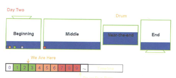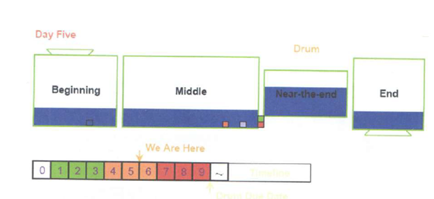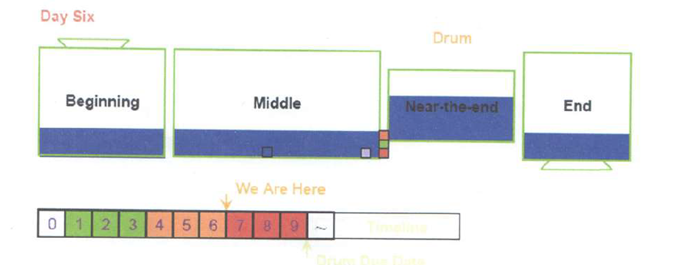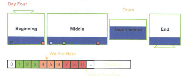 قطعه بنفش در روز هفتم کارش به اتمام رسیده است. اما قطعه آبی هنوز در حال طی کردن فرآیند تولیدش می باشد. طبق برنامه زمان بندی، همه قطعات پیش از آغاز روز دهم باید به جلوی ایستگاه گلوگاهی رسیده باشند تا گلوگاه دچار از کار افتادگی نگردد.